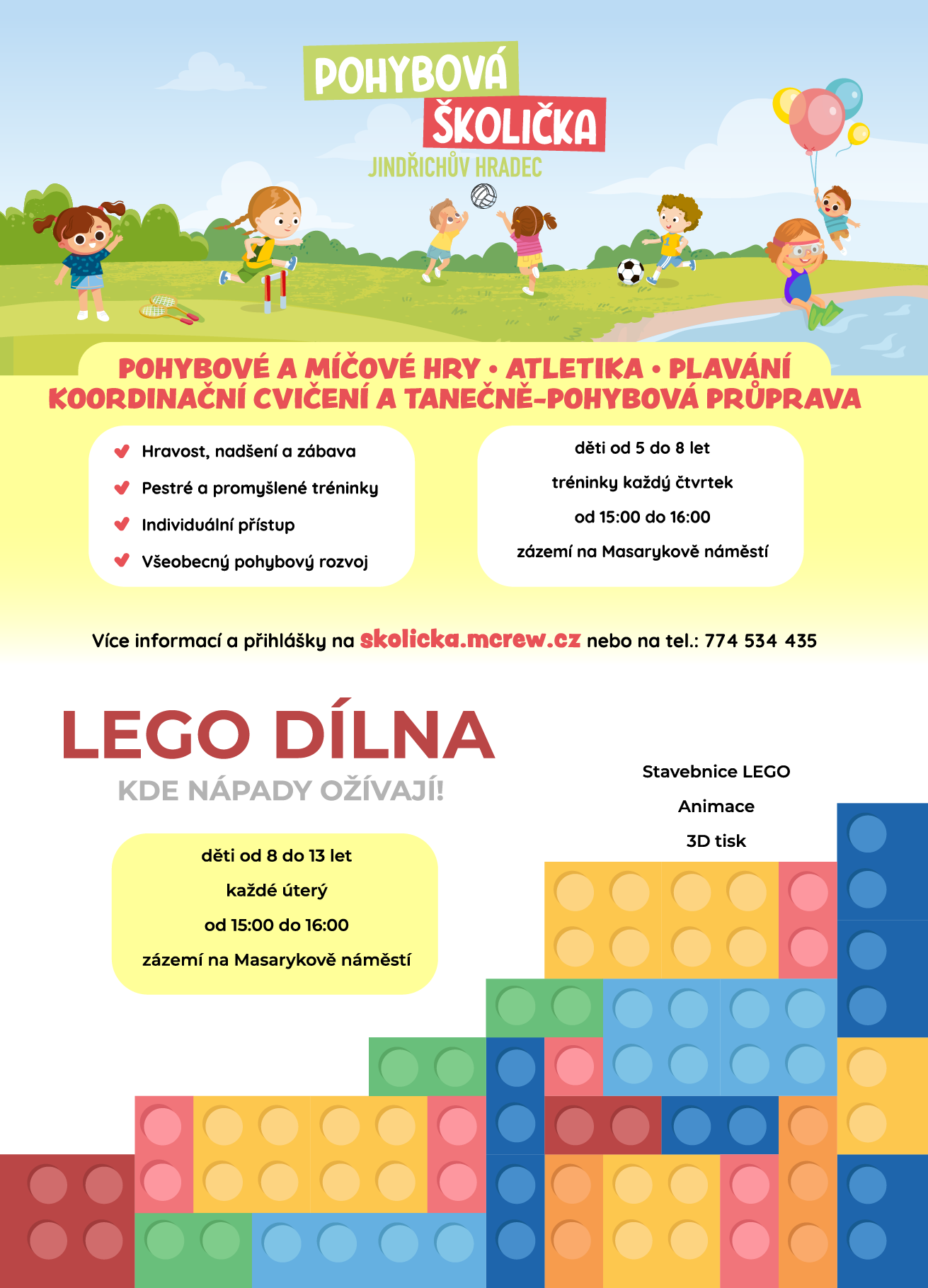 Registrace na školní rok 2024/25 otevřeny! POHYBOVÁ ŠKOLIČKA 2000 Kč za pololetí celkem 32 tréninků za školní rok Tréninky Registrace LEGO DÍLNA 2400 Kč za pololetí celkem 32 lekcí za školní rok Lekce Registrace Kontakt Tomáš Vaněk 774 534 435 tomas.vanek@mcrew.cz
